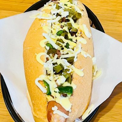 Our signature dog. Shredded cheese, cheese sauce, house burger sauce, pickle, bacon & jalapeños This one’s the boss — cheesy, crunchy, tangy and hot all at once