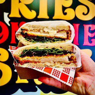 Crispy, golden chicken schnitzel — fresh chicken breast crumbed in Japanese-style panko. Layered with house-made lemon herb mayo and fresh leaf, all tucked into locally baked sandwich bread.