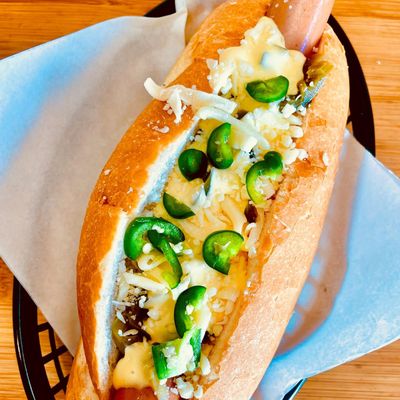 Locally made, smoked German-style frank, topped with jalapeños, creamy mayo, shredded cheese, & cheese sauce. Creamy, cheesy and just a little cheeky.